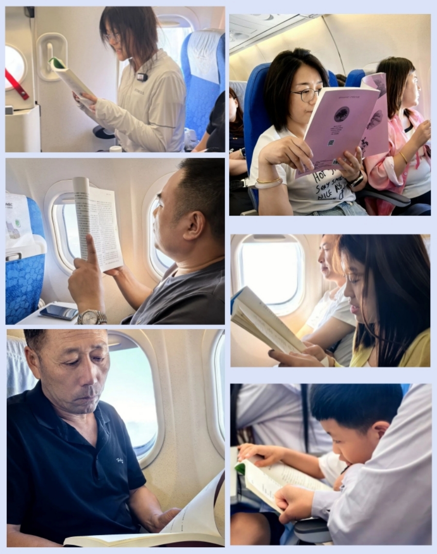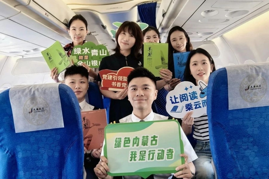 在天骄航空9D5665次航班上,天骄航空公司和内蒙古文学杂志社的党员代表以党课为载体,以书香为媒,向旅客宣讲党的建设、生态文明建设和北疆文化有关知识,通过邀请旅客诵读内蒙古自治区唯一省级文学杂志《草原》生态文学选段、云端打卡、有奖问答等方式,将党建与全民阅读相融合,借助天骄航空机上平台,把党课与书香融入旅途,在蓝天之上感受信仰的力量,并倡议保护生态环境,共建绿色家园。