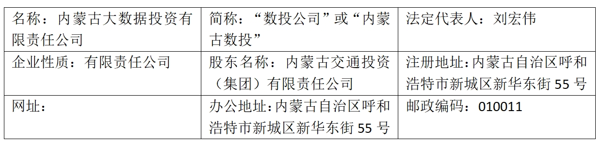 内蒙古大数据投资有限责任公司是经自治区发改委、自治区大数据局批准于2018年5月成立,职责是为贯彻落实《国务院关于印发促进大 数据发展行动纲要的通知》《内蒙古国家大数据综合试验区建设实施方案》《内蒙古自治区促进大数据发展应用若干政策》等文件精神,推动数据整合、共享和开放,助力政府提升政府信息化水平,为实现政务的全面转型升级奠定基础。同时,承担着建设、运营国家电子政务云数据中心北方节点的任务,为国家各部委和自治区提供政务数据运营支撑服务,统一建设大数据应用平台,整合国内优质资源,实现信息共享。我公司另一个职责是数据信息产业的投资、运营业务及技术服务业务。目前,公司已取得ISO9001质量管理体系认证证书、ISO14001环境管理体系认证证书、ISO45001职业健康安全管理体系认证证书、IEC27001信息安全管理体系认证证书、信息安全技术大数据安全管理认证证书、IEC20000-1信息技术服务管理体系认证证书、IEC27017云服务信息安全管理体系认证、企业信用等级AAA级、数商证书等十八项证书。