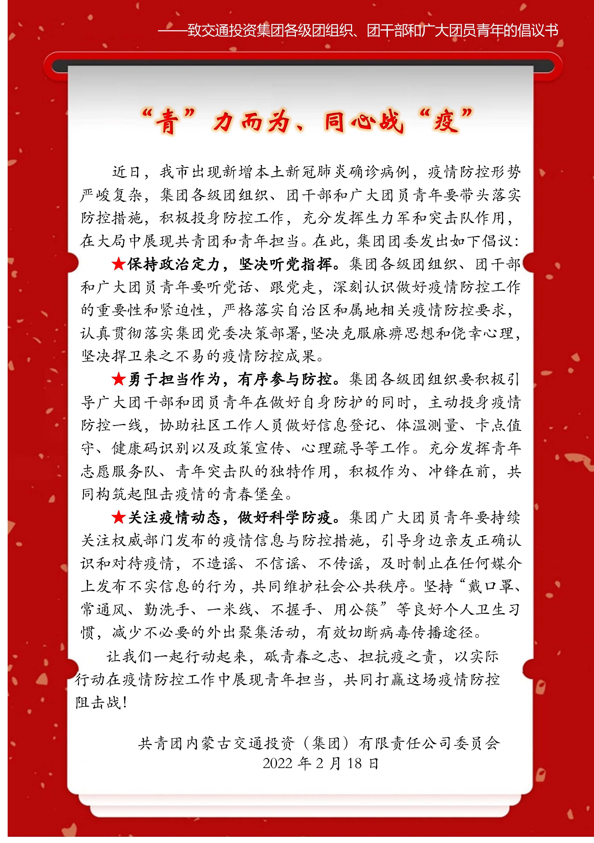 “青”力而为、同心战“疫”致集团各级团组织、团干部和广大团员青年的倡议书