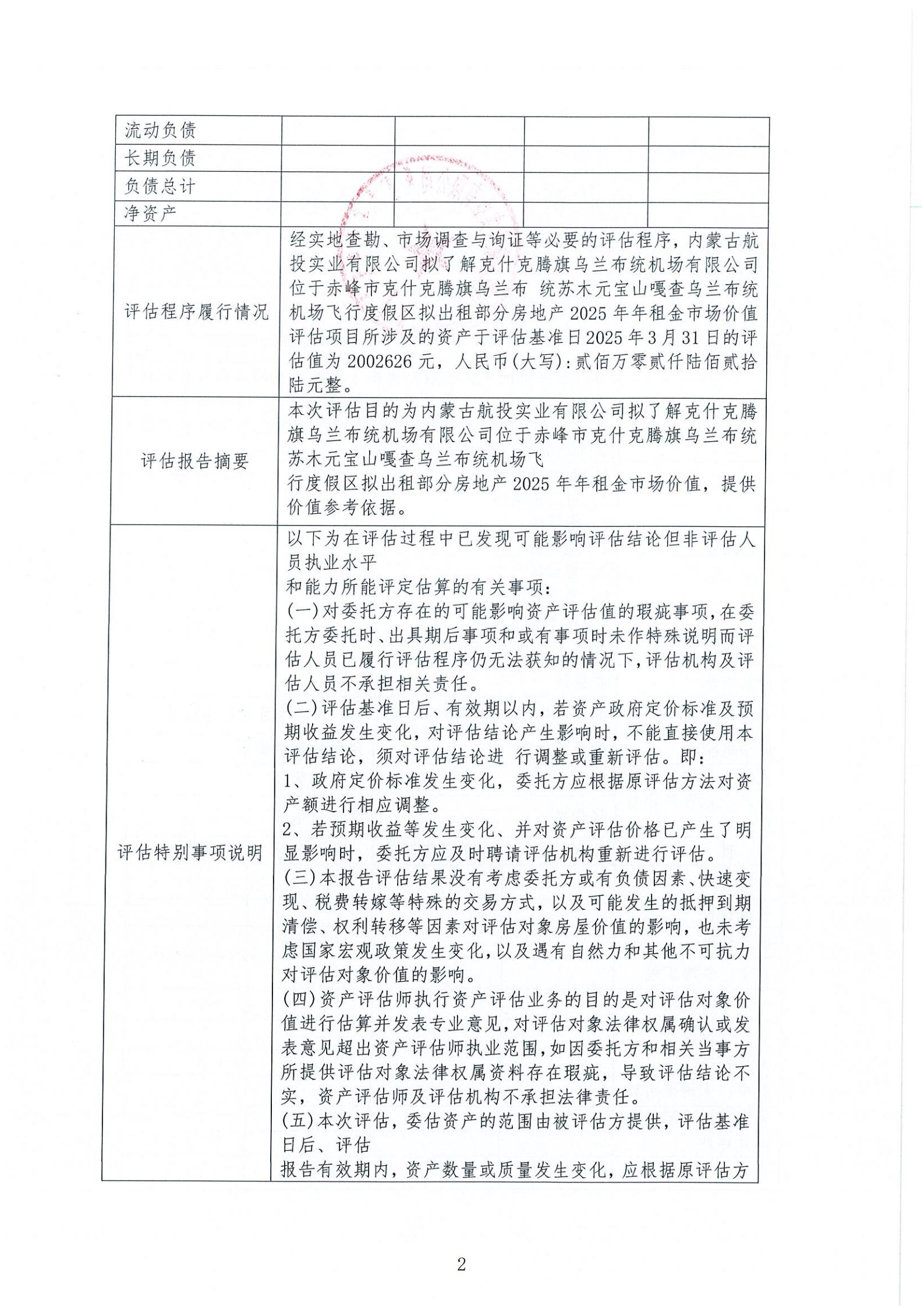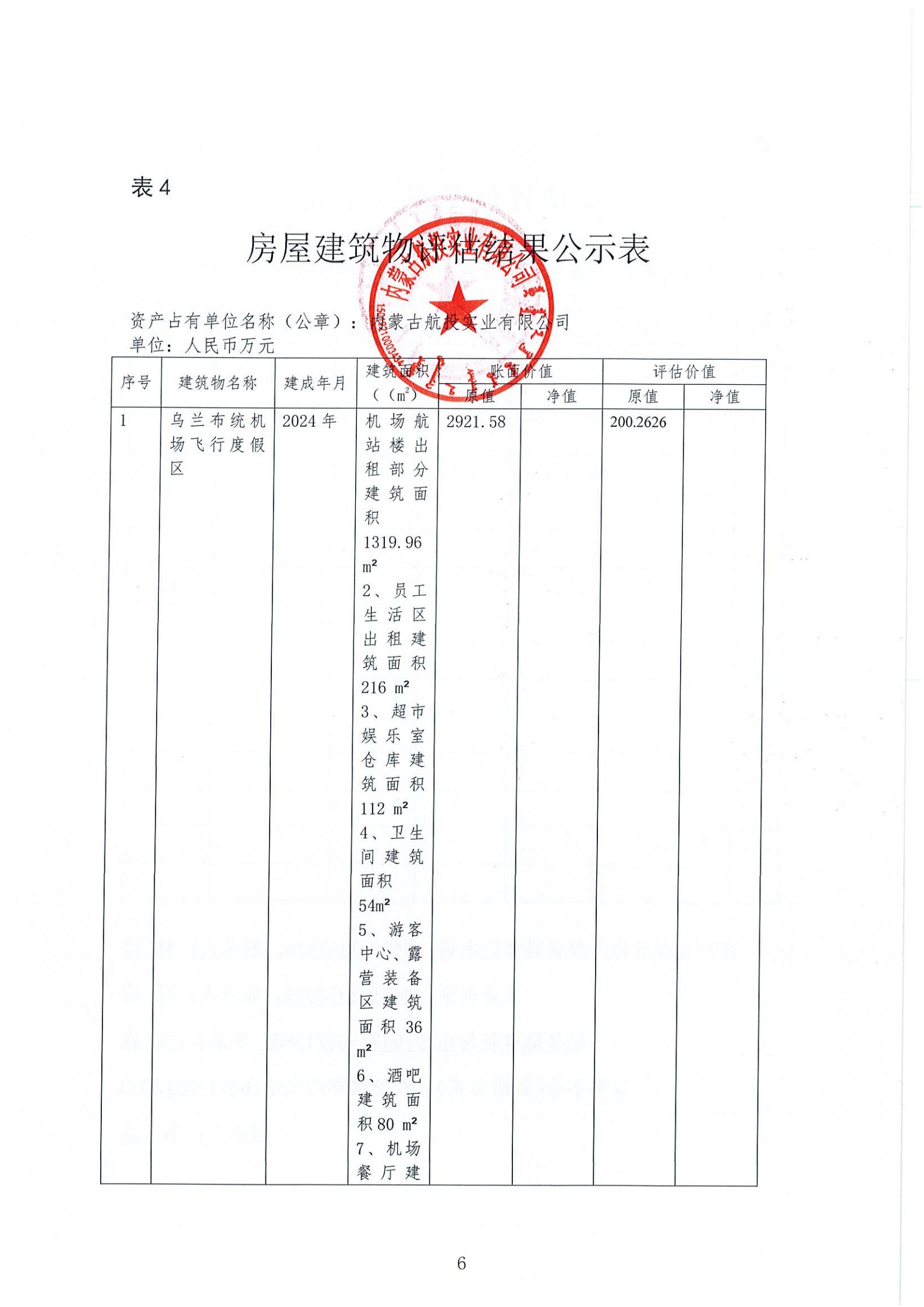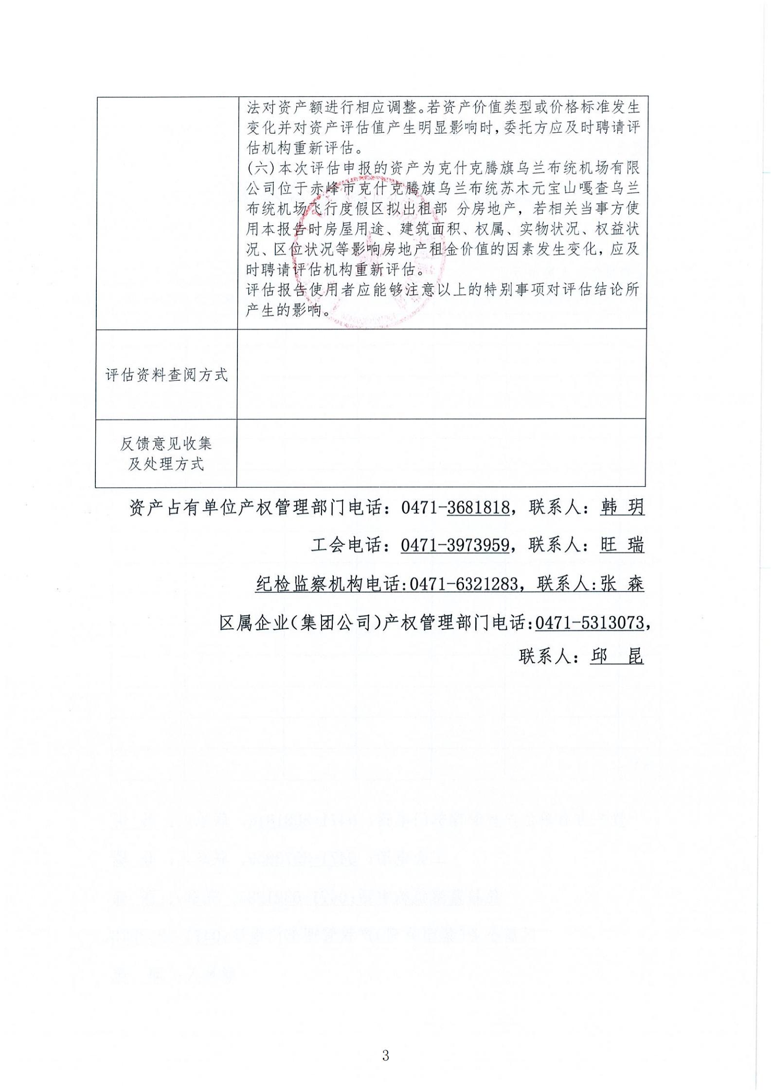 根据《内蒙古自治区区属企业国有资产评估项目公示办法《内蒙古交通投资(集团)有限责任公司国有资产评估 管理办法(试行)》相关规定,为依法合规开展我公司国有 资产评估行为,建立有效监督机制,做到国有资产评估管理,工作规则公开、过程公开、结果公开,依法保障资产评估项 目相关各方知情权和监督权,现将内蒙古航投实业有限公司对其乌兰布统机场飞行度假区拟出租部分房地产2025年年租金市场价值进行资产评 估项目结果进行公示,公示内容详见附表。公示有效期:2025年5月7日-5月12日。