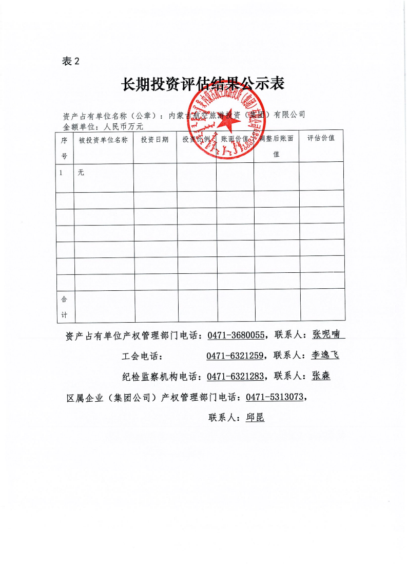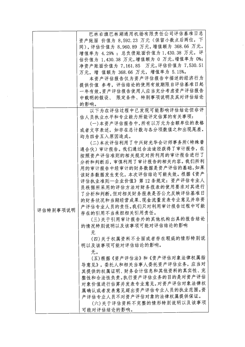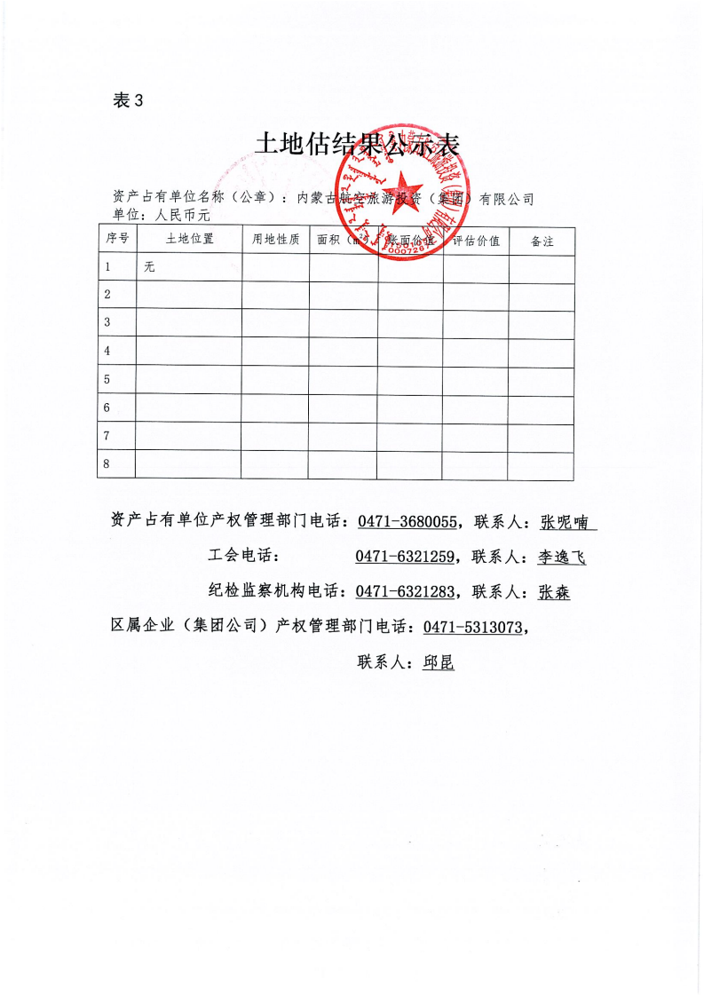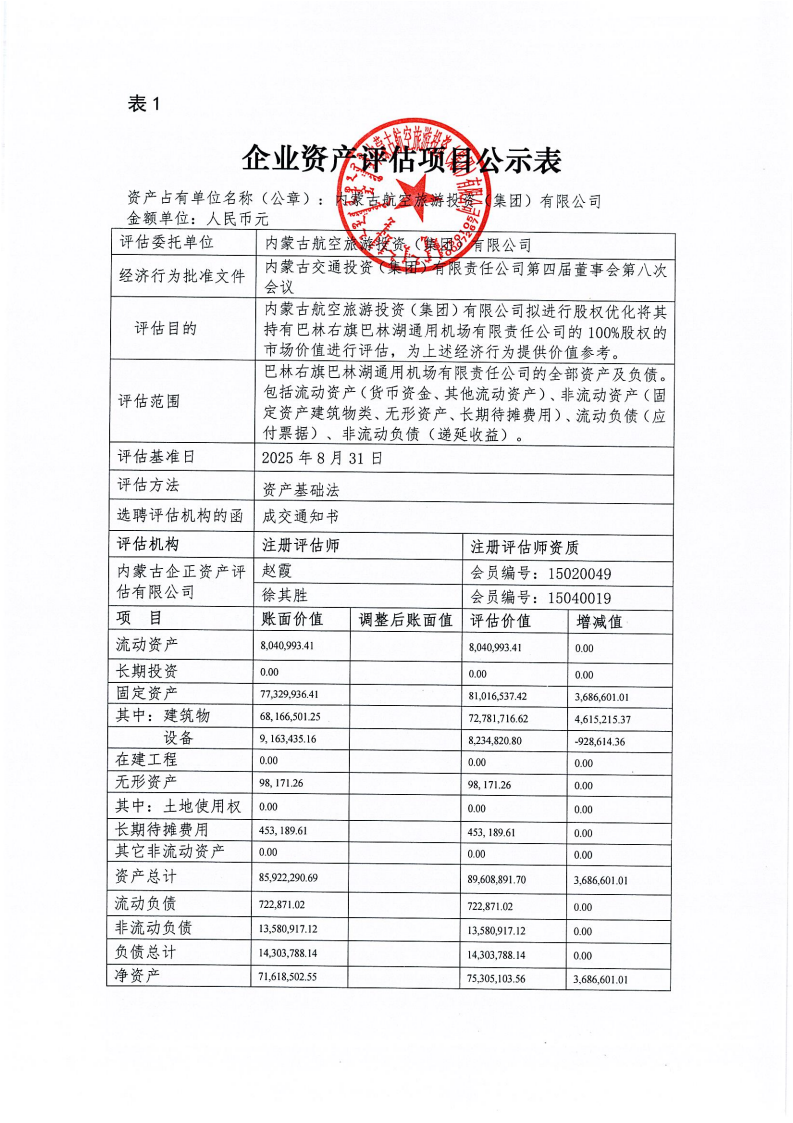 根据《内蒙古自治区区属企业国有资产评估项目公示办法》《内蒙古交通投资(集团)有限责任公司国有资产评估管理办法(试行)》相关规定,为依法合规开展我公司国有资产评估行为,建立有效监督机制,做到国有资产评估管理,工作规则公开、过程公开、结果公开,依法保障资产评估项目相关各方知情权和监督权,现将内蒙古航空旅游投资(集团)有限公司所持有巴林右旗巴林湖通用机场有限责任公司100%股权的市场价值进行资产评估,项目结果进行公示,公示内容详见附表。公示有效期:2025年9月19日-9月25日。